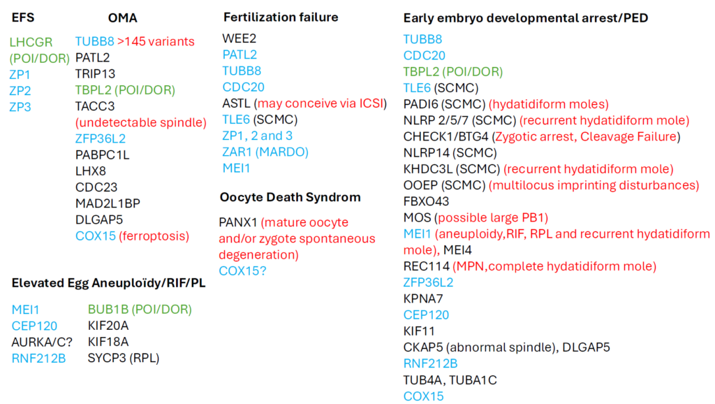 Le bilan étiologique des infertilités féminines et masculines n’aboutit pas toujours à une cause clairement identifiée ; chez l’homme, une part importante des anomalies du spermogramme reste inexpliquée en pratique. Dans les formes sévères, notamment en contexte de consanguinité, le séquençage de l’exome et les études familiales ont mis en évidence des causes monogéniques. Chez l’homme, des variants pathogènes sont décrits dans les hypogonadismes hypogonadotropes congénitaux, l’agénésie des canaux déférents, certaines tératozoospermies monomorphes et l’azoospermie non obstructive. Chez la femme, des variants de gènes effecteurs maternels (MEG) sont impliqués dans des phénotypes sévères en FIV, allant de l’échec de maturation ovocytaire à l’échec de fécondation ou à l’arrêt du développement embryonnaire, regroupés dans OMIM sous le phénotype OZEMA. En l’absence de consensus sur les indications du séquençage, la répétition d’échecs inattendus et certains tableaux évocateurs (p. ex. syndrome de mort ovocytaire lié à PANX1) doivent alerter. D’autres variants peuvent se manifester par une augmentation d’aneuploïdies, des échecs d’implantation ou des fausses couches. Par ailleurs, la susceptibilité polygénique est démontrée pour certaines causes, notamment le SOPK, et la pharmacogénomique pourrait guider l’individualisation des stimulations. Enfin, le séquençage à lecture longue ouvre des perspectives (variants structuraux, accès au génome entier, méthylome) tout en posant des défis d’interprétation, d’éthique et de conseil génétique.