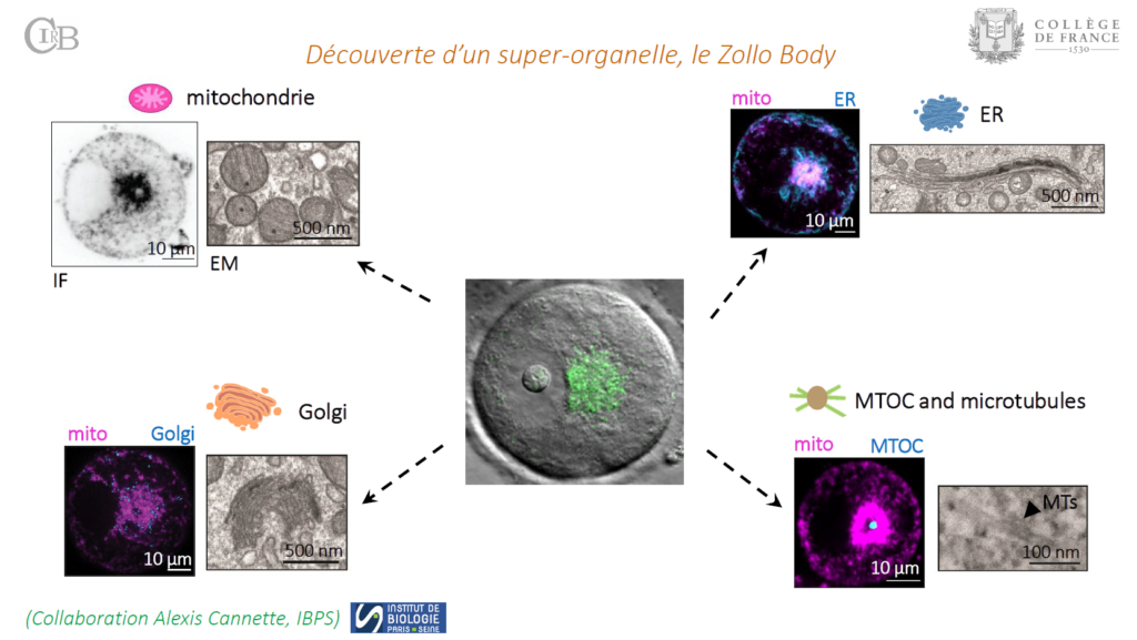 Les ovocytes mammifères présentent une phase de croissance prolongée, au cours de laquelle la transcription diminue progressivement. Pour soutenir les divisions méiotiques et le développement embryonnaire précoce, les ovocytes en croissance doivent accumuler des réserves maternelles et réguler étroitement la traduction. À l’aide de l’immunofluorescence, de la spectrométrie de masse, de la microscopie électronique, du séquençage d’ARN et de l’imagerie ex vivo de coupes de tissu ovarien vivant, nous avons identifié un nouveau compartiment cellulaire transitoire dans les ovocytes de souris en fin de croissance, que nous avons nommé « corps de Zollo ». Bien qu’il ressemble au corps de Balbiani observé dans les ovocytes primordiaux de nombreuses espèces de vertébrés, le corps de Zollo apparaît à un stade plus tardif et présente une traduction naissante et un enrichissement en phospho-mTOR. La supinoxine (inhibiteur de Ddx5) dissout rapidement le corps de Zollo et arrête la croissance des follicules et des ovocytes dans les coupes de tissu ovarien en culture. Ainsi, le corps de Zollo est un compartiment transitoire associé à la traduction, nécessaire à la croissance normale des follicules et des ovocytes.