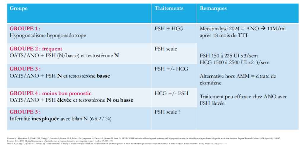La stimulation hormonale (par gonadotrophines ou modulateurs de sélectifs des récepteurs) a une place croissante et nécessite une prescription personnalisée en fonction du profil hormonal et après avoir éliminé les autres causes d’infertilité (en particulier varicocèle). Les récents critères d’APHRODITE permettent de faciliter la prescription via une catégorisation des groupes de patients et des gonadotrophines à privilégier. Ces traitements ont prouvé leur efficacité pour optimiser la spermatogenèse et les chances de succès de grossesses naturelles ou médicalement assistées et parfois pour éviter un prélèvement testiculaire. Enfin, l’utilisation de l’application mobile Seedly s’inscrit comme un levier moderne pour améliorer l’observance du patient et sécuriser la surveillance rigoureuse nécessaire des hommes infertiles.
